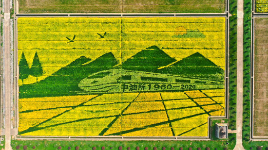 近幾年來(lái),該團(tuán)隊(duì)利用油菜表型精準(zhǔn)鑒定技術(shù)、誘變等種質(zhì)創(chuàng)新技術(shù),自主發(fā)掘創(chuàng)制出“美農(nóng)”系列乳白、金黃、橘黃等系列多彩觀光油菜新品種(系),融合景觀設(shè)計(jì)與精細(xì)施工、油菜田間管理和花期調(diào)控等多項(xiàng)技術(shù)與文化創(chuàng)意相結(jié)合,創(chuàng)制了“綠水青山”和“長(zhǎng)江大保護(hù)”等多個(gè)主題油菜景觀畫(huà),建立了科技與文化相融合的種植模式和技術(shù)體系,為觀光農(nóng)業(yè)發(fā)展提供了有力的技術(shù)支撐。今年所創(chuàng)制的兩幅“油菜花”,主題分別是面積為15畝的“高速前進(jìn)的中油所”,面積為7畝的“不忘初心,牢記使命”。
