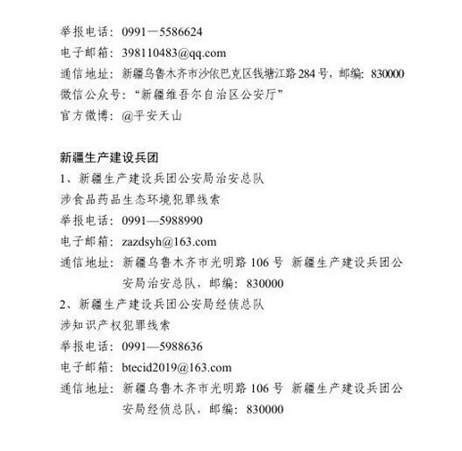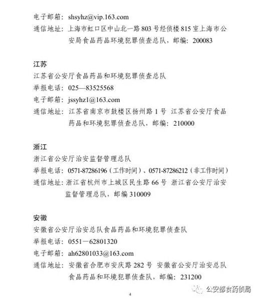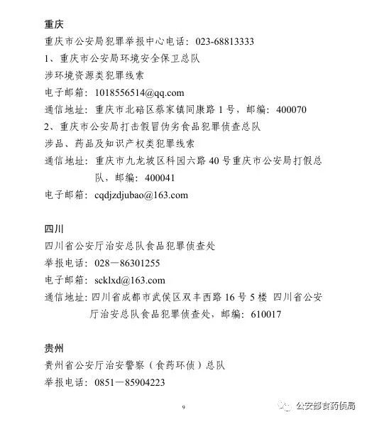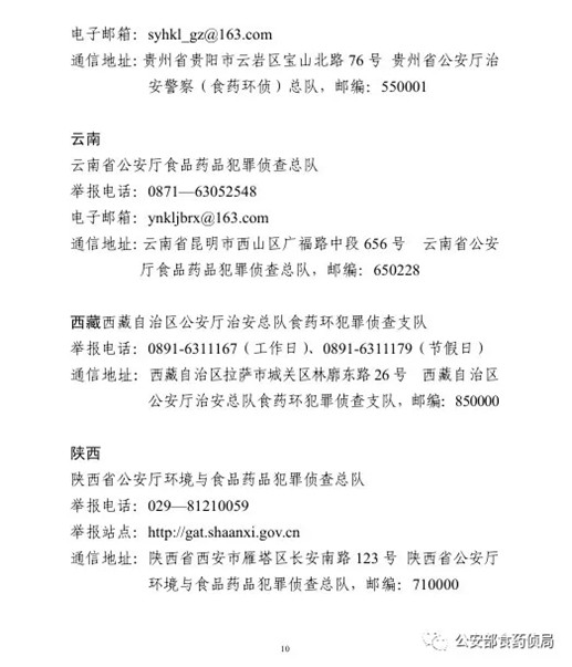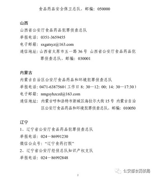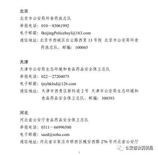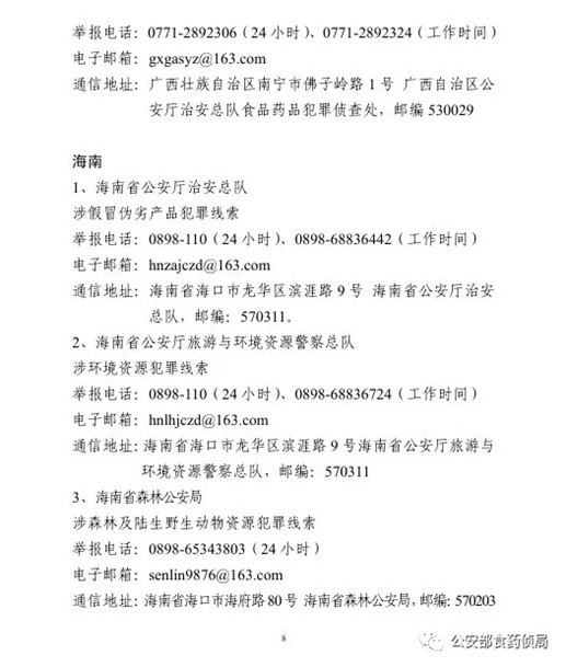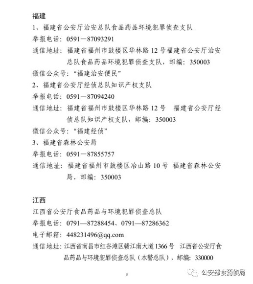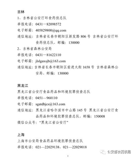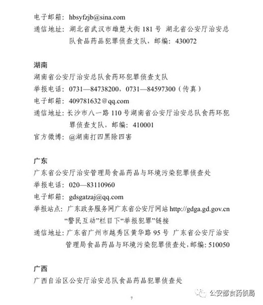 為確保農(nóng)資打假工作取得扎實(shí)成效,目前,公安部食藥偵局將全國(guó)各省級(jí)公安機(jī)關(guān)監(jiān)督舉報(bào)方式予以公布,歡迎廣大群眾積極舉報(bào)相關(guān)違法犯罪活動(dòng)線索。