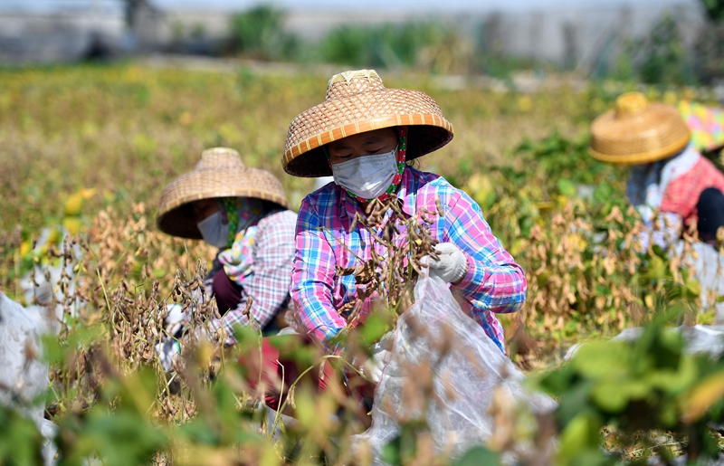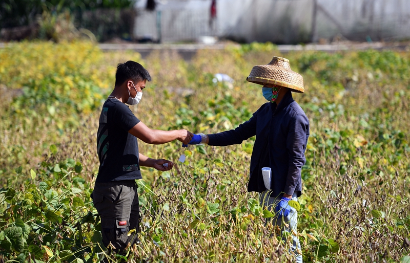 早春時節(jié),海南三亞的南繁科研工作進入了繁忙季節(jié)。為減少疫情對科研工作帶來的影響,三亞市南繁科學技術研究院通過與省外的南繁單位進行視頻連線,開展代管、代收、寄送等服務,多措并舉,確保南繁科研不間斷。圖為2月27日,工人在采收中國農業(yè)科學院油料作物研究所在三亞繁育的大豆。新華社記者 郭程/攝