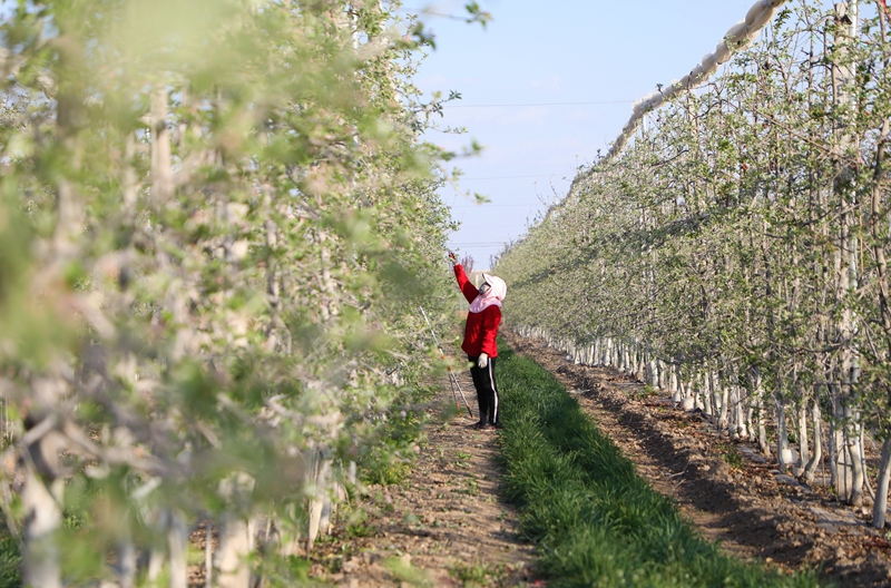 進入4月,甘肅省慶陽市寧縣蘋果生產基地一片農忙景象,果農們?yōu)楣麡浼羧ザ嘤嗟闹θ~,保證花期順利到來。蘋果產業(yè)是寧縣目前的主導扶貧產業(yè),近三年間,寧縣借助蘋果產業(yè)帶動全縣9000余戶貧困戶穩(wěn)定脫貧。圖為寧縣王莊村村民劉彩紅在蘋果生產基地內修剪果樹。新華社記者 張睿/攝