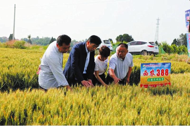 五月的關(guān)中麥田,麥子逐漸變黃了,一片片麥浪隨風(fēng)擺動望不到盡頭。粗壯的秸稈上挑著蓬乍乍的穗頭,熟得那么歡暢,深沉,像串串金色的汗珠,像無邊的金色的海。5月22日上午,陜西省扶風(fēng)縣農(nóng)業(yè)農(nóng)村局、扶風(fēng)縣種子管理站與來自陜西省內(nèi)小麥種子經(jīng)銷商200余人齊聚陜西潤農(nóng)種業(yè)有限責(zé)任公司小麥良種繁育基地,現(xiàn)場觀摩了西北農(nóng)林科技大學(xué)王輝教授培育的西農(nóng)388、王明岐老師培育的西農(nóng)3517等優(yōu)秀小麥品種。