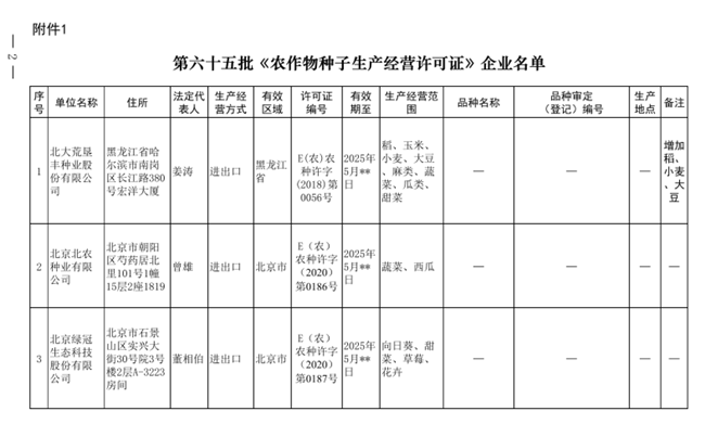 附件:1.第六十五批《農(nóng)作物種子生產(chǎn)經(jīng)營許可證》企業(yè)名單