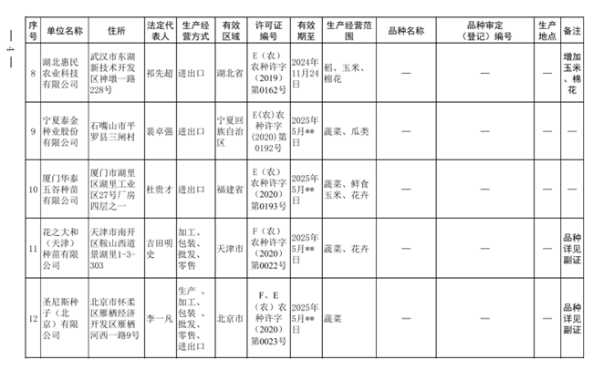 根據(jù)《中華人民共和國種子法》《農(nóng)業(yè)轉(zhuǎn)基因生物安全管理條例》和《農(nóng)作物種子生產(chǎn)經(jīng)營許可管理辦法》《轉(zhuǎn)基因棉花種子生產(chǎn)經(jīng)營許可規(guī)定》等有關(guān)規(guī)定,批準(zhǔn)發(fā)放北大荒墾豐種業(yè)股份有限公司等12家企業(yè)《農(nóng)作物種子生產(chǎn)經(jīng)營許可證》(詳見附件1),批準(zhǔn)發(fā)放河北藍(lán)鷹種業(yè)有限公司等2家《轉(zhuǎn)基因棉花種子生產(chǎn)經(jīng)營許可證》(詳見附件2)。