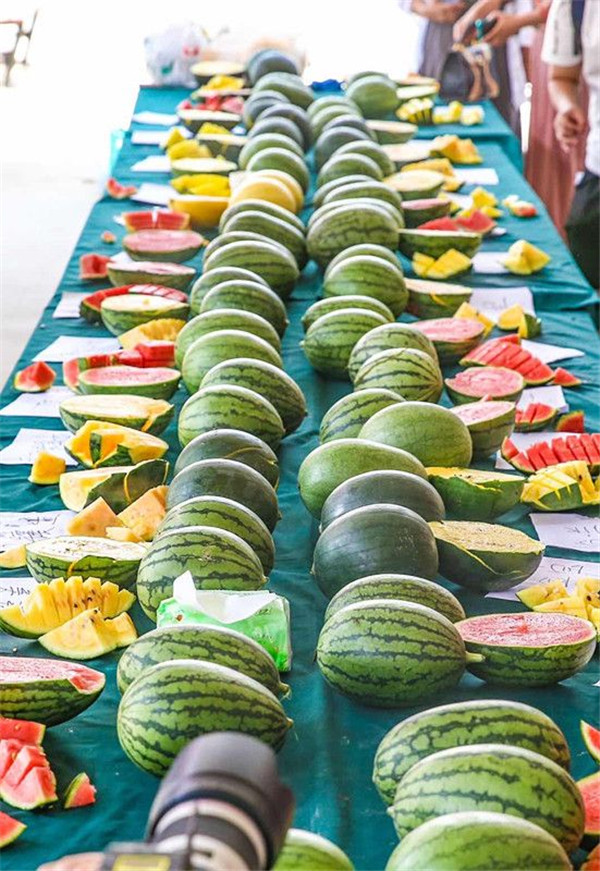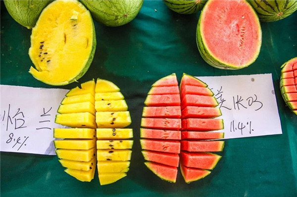在“擺擂”現(xiàn)場,還有市民反映,像“中玉1號”雖然測出的糖度沒有一旁的“京美2K”高,但是反而口感更佳濃郁芳香。“這是因?yàn)樘嵌葴y量不僅包含人們能感到甜味的果糖、蔗糖,還有甜度偏淡的葡萄糖,所以糖度高不代表口感好。”馬超提示,市民如果喜歡甜度適中、更加營養(yǎng)的西瓜,可以考慮黃色、彩虹瓤的“京彩”系列、“炫彩”系列、“怡蘭”等品種,這類西瓜相比紅瓤西瓜含有更多葉黃素、β胡蘿卜素,對視力、皮膚等都有良好保健作用。