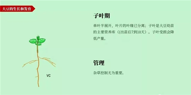 從出苗到花芽分化前為幼苗期。出苗后 2 片子葉展開,其幼莖繼續(xù)伸長,上面的 2 片對生的單葉隨即展開,此時稱單葉期。隨著幼莖不斷伸長,長出第一片復葉時稱 3 葉期。3 葉期地上部分增長速度較慢,地下根系生長較快形成根瘤。此期末根系初步形成,開始需要較多的水分和養(yǎng)料。幼苗期大約 20-25d,占整個生育期的 1/5,這一時期是長根期;應注意蹲苗,加強田間管理,達到苗全、苗勻、苗壯,為豐產打下基礎。