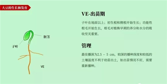 胚根首先從胚珠珠孔伸出,當胚根伸長到與種子等長時稱發(fā)芽。胚軸伸長,種皮脫落,子葉隨下胚軸伸長露出土面,當子葉展開時稱出苗。條件適宜,播種后4—6d黃豆即可出苗。田間半數(shù)以上子葉出土即為出苗期。
