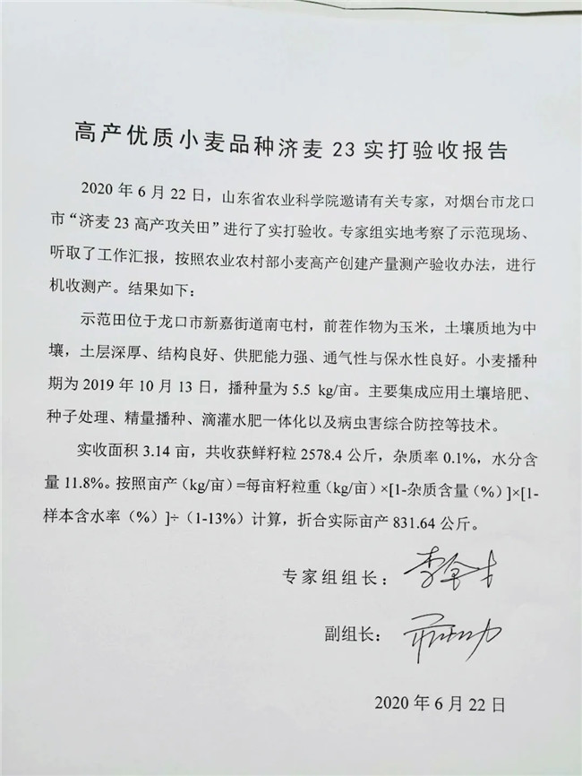 6月22日,煙臺(tái)龍口傳來喜訊:由山東省農(nóng)科院作物所與中國農(nóng)科院作科所合作選育的小麥新品種濟(jì)麥23經(jīng)專家實(shí)打畝產(chǎn)831.64公斤,刷新了該品種2019年在煙臺(tái)招遠(yuǎn)實(shí)打畝產(chǎn)821.49公斤的成績,連續(xù)兩年畝產(chǎn)超過820公斤。