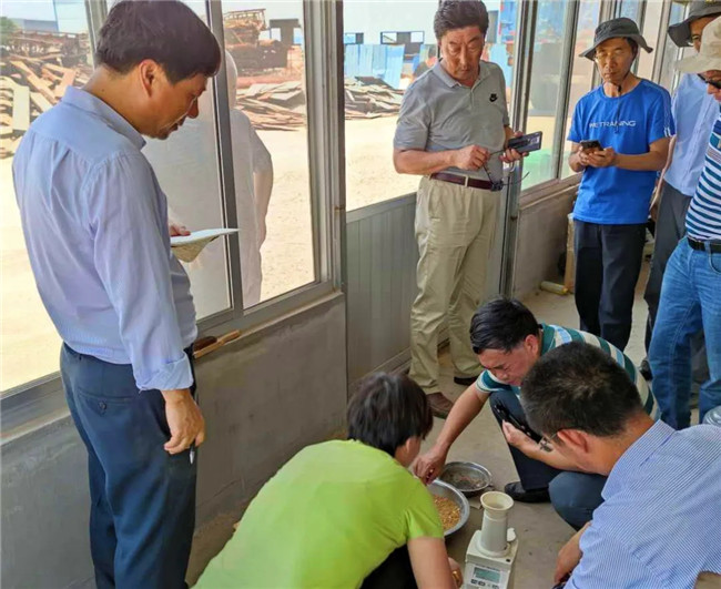 在位于煙臺(tái)市龍口市新嘉街道南屯村的濟(jì)麥23高產(chǎn)示范田里,來自安徽農(nóng)業(yè)大學(xué)、山東農(nóng)業(yè)大學(xué)、山東省種子管理總站、山東省農(nóng)技推廣總站、徐州市農(nóng)業(yè)科學(xué)院的5名專家組成的專家組,對(duì)作物所承擔(dān)的山東省農(nóng)科院農(nóng)業(yè)科技創(chuàng)新工程等項(xiàng)目實(shí)施的濟(jì)麥23高產(chǎn)示范進(jìn)行了現(xiàn)場實(shí)打驗(yàn)收。按照農(nóng)業(yè)農(nóng)村部小麥高產(chǎn)創(chuàng)建產(chǎn)量測產(chǎn)驗(yàn)收辦法,經(jīng)過丈量、機(jī)械收獲、稱重、水分測定、雜質(zhì)率測算等環(huán)節(jié),形成驗(yàn)收意見:實(shí)收面積3.14畝,收獲鮮籽粒2578.4公斤,雜質(zhì)率0.1%,水分含量11.8%,按13%標(biāo)準(zhǔn)水分含量折算,畝產(chǎn)831.64公斤。