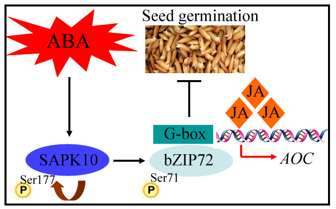 該團隊研究發(fā)現(xiàn)脫落酸信號途徑關(guān)鍵因子SnRK2類激酶SAPK10磷酸化修飾自身的第177位絲氨酸并增強其活性,進而磷酸化修飾下游的bZIP轉(zhuǎn)錄因子家族成員bZIP72的第71位絲氨酸。進一步研究表明,磷酸化修飾增強了bZIP72結(jié)合茉莉酸合成途徑關(guān)鍵基因AOC的能力,并促進后者的轉(zhuǎn)錄,從而提高體內(nèi)的茉莉酸水平并抑制種子萌發(fā)。另一方面,外施茉莉酸合成抑制劑可緩解脫落酸對種子萌發(fā)的抑制,暗示著脫落酸對種子萌發(fā)的抑制效應(yīng)部分依賴于茉莉酸的合成。