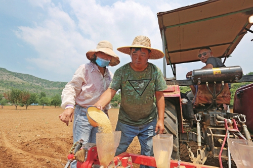 近日,河南省林州市東姚鎮(zhèn)黃路坡村西,農(nóng)民正在播種優(yōu)質(zhì)旱作谷子“豫谷18”。這里是林州東姚洪河小米原產(chǎn)腹地,在返鄉(xiāng)創(chuàng)業(yè)人士原云周承包的120畝山果林地間,一派繁忙的勞動景象。