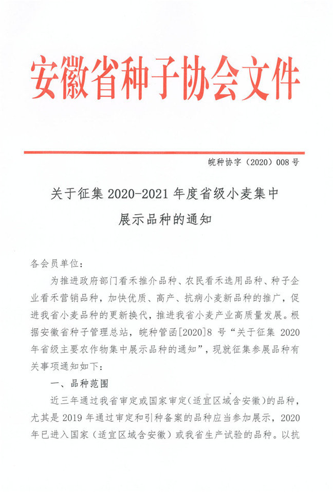 關(guān)于征集2020-2021年度省級(jí)主要小麥集中展示品種的通知