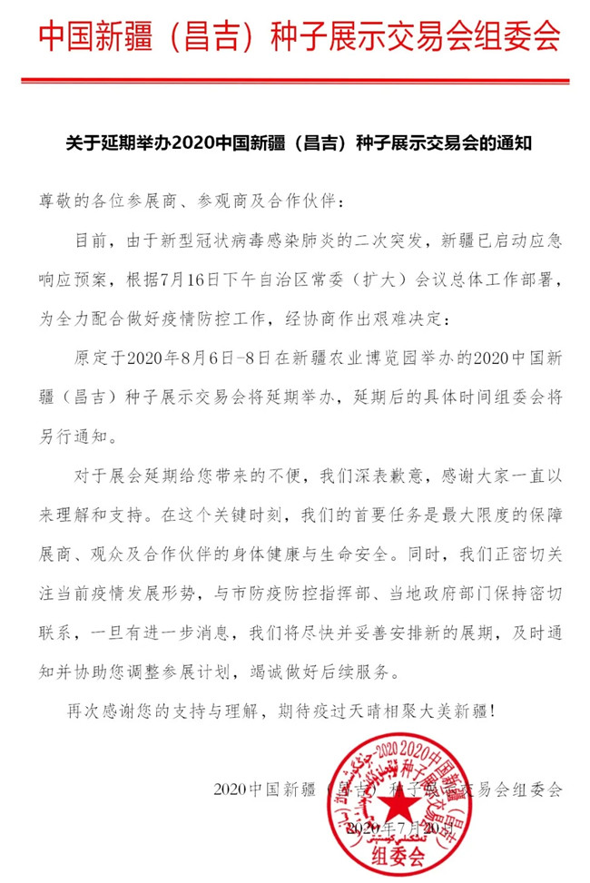 轉(zhuǎn)擴(kuò)!2020中國(guó)新疆(昌吉)種交會(huì)延期舉辦!