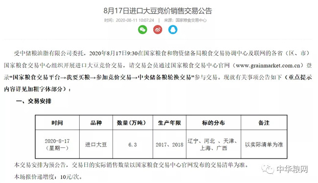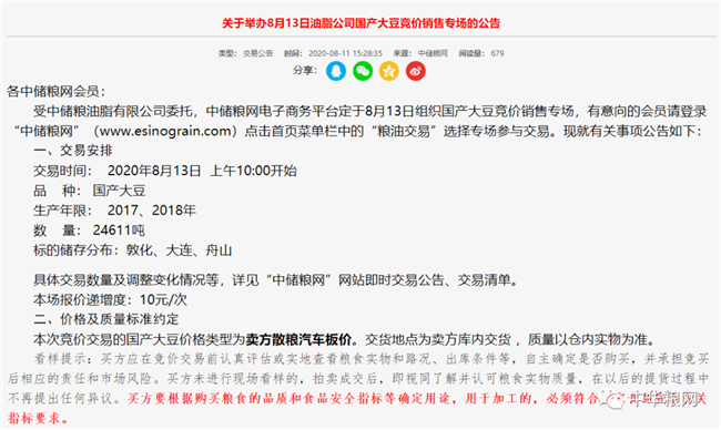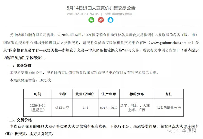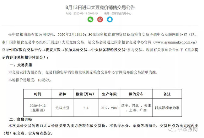 此外,昨日(8月11日)中儲(chǔ)糧網(wǎng)終于發(fā)布了國(guó)產(chǎn)大豆拍賣公告。