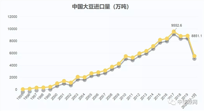 今年7月份我國(guó)大豆進(jìn)口再破千萬(wàn)噸,達(dá)到1009.1萬(wàn)噸,至此,今年1-7月的大豆累計(jì)進(jìn)口量已經(jīng)高達(dá)5513.5萬(wàn)噸,同比增加17.7%,近兩成。