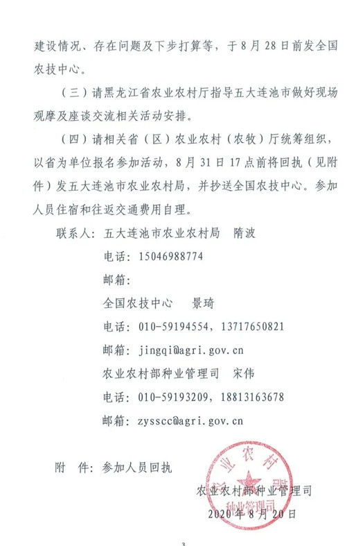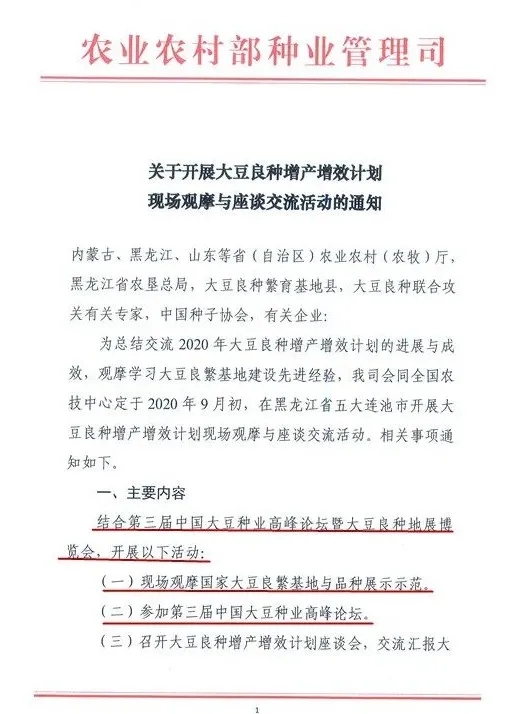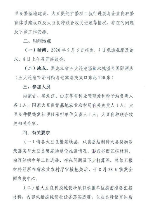 繼中國種子協(xié)會8月13日下發(fā)《關于召開第三屆中國大豆種業(yè)高峰論壇暨大豆良種地展博覽會的通知》。定于2020年9月6-8日在五大連池市共同舉辦“第三屆中國大豆種業(yè)高峰論壇暨大豆良種地展博覽會”,同期將舉辦全國專用大豆產業(yè)聯(lián)盟會議后,農業(yè)農村部種業(yè)管理司也于8月20日下發(fā)了《關于開展大豆良種增產增效計劃現(xiàn)場觀摩與座談交流活動的通知》(以下簡稱《通知》)。通知指出,為總結交流2020年大豆良種增產增效計劃的進展和成效,觀摩學習大豆良繁基地建設經驗,種業(yè)管理司會同全國農技中心定于2020年9月6-8日在黑龍江省五大連池市開展大豆良種增產增效計劃現(xiàn)場觀摩與座談交流活動。