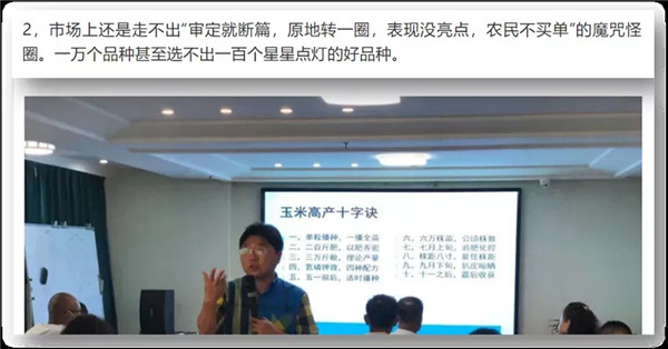 據(jù)東北區(qū)域的玉米種業(yè)界達(dá)人楊大海先生坦言:當(dāng)前審定的玉米品種“同質(zhì)化”太嚴(yán)重,真正好的玉米品種比例不到“百分之一”。(見下圖)