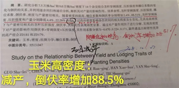 例子三:河南省農(nóng)科院郭書磊博士科研結(jié)果證明,玉米高密度“十密九倒”