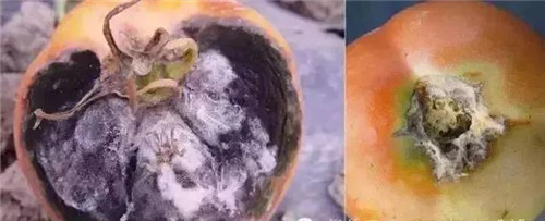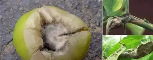 果實(shí)及果柄受害:始于果柄,并向果面蔓延,致未成熟果實(shí)似水燙過,受害果實(shí)上可產(chǎn)生白霉,后可產(chǎn)生黑色菌核。