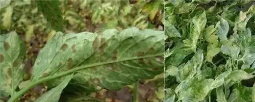 葉發(fā)病:近地面老葉先發(fā)病,初期葉背出現(xiàn)水浸狀暗綠色小斑,擴(kuò)展成近圓形或不規(guī)則形邊緣明顯黃褐色病斑,有黃暈圈,內(nèi)部較薄,具油脂狀光澤。