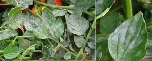 葉片發(fā)?。褐饕獮楹χ邢虏咳~片,初期葉面生褪綠色小點(diǎn),后擴(kuò)大為不規(guī)則形粉斑,細(xì)看有稀疏霉層,隨著病斑擴(kuò)大連片或覆蓋全葉面,白色霉層逐漸明顯,致全葉變褐干枯而死。