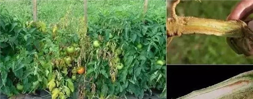 幼苗染病:真葉從下向上打蔫,葉柄或胚軸上出現(xiàn)凹陷壞死斑,橫剖病莖可見維管束變褐,髓部出現(xiàn)空洞。