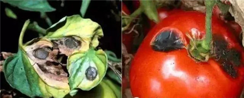 在果實(shí)膨大后期發(fā)?。褐仓暄杆傥杩菟?,似青枯癥狀,但無(wú)菌膿。此外,病部常有同心輪紋的橢圓形或不規(guī)則形褐色病斑,后期表面常形成淡褐色霉?fàn)钗锘虼笮〔灰缓诤稚木?,有別于早疫病。