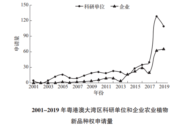 但與全國的情況稍有不同,粵港澳大灣區(qū)品種權(quán)申請單位主要是各級農(nóng)科院、農(nóng)業(yè)事業(yè)單位和農(nóng)業(yè)高校等科研單位,企業(yè)僅在2014年與科研單位相持平。2014年以后,粵港澳大灣區(qū)種子企業(yè)的品種權(quán)申請數(shù)量雖然有所增加,但是依舊未超過科研單位。