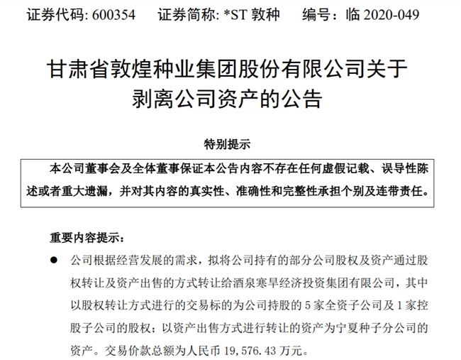 敦煌種業(yè):甘肅國資委成控制人;同時,公司剝離轉讓6家子公司,交易預計取得收入1.96億元,只為有利于公司聚焦種子主業(yè),優(yōu)化資產負債結構?