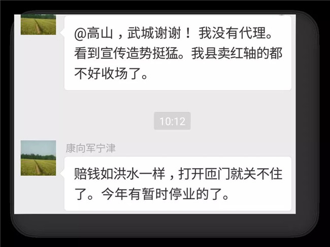 因為,你有“農(nóng)業(yè)真科技”在心中,由此而得到你在當(dāng)?shù)?span lang="EN-US">20%~30%的市場份額(種植戶的忠誠度較高且科技素質(zhì)較高),從而拒絕“暴利化的公司”或者“忽悠式公司”(一些公司因為某一特長的壟斷來“壓榨代理商的利潤”,或者如同韓俊強先生所批評的一些“品種多,爛種多”所謂大公司靠會議銷售模式的氣氛“忽悠比較幼稚的代理商”)。