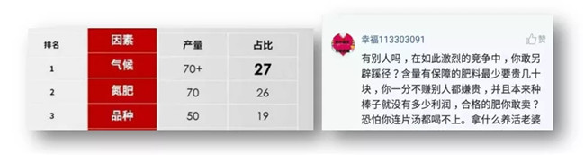 比如:美國弗雷德教授研究認為,玉米用氮肥對產(chǎn)量的影響占到1/4強,遠遠大于品種對產(chǎn)量的占比(換一句話講:氮肥不足,任何玉米品種都高產(chǎn)不了)。而磷鉀肥,可以借用前茬小麥的而“一肥兩用”。特別是小麥前茬使用二銨,由于水溶性磷高達95%,1斤二銨的有效磷強過6斤復(fù)合肥(玉米用的復(fù)合肥水溶性磷的標(biāo)準(zhǔn)低,甚至很多偽劣復(fù)合肥,原料只有低廉的氯化銨)。見下附圖和玉米用氮肥的重要性占比和一位“賣復(fù)合肥的”口吐真言。