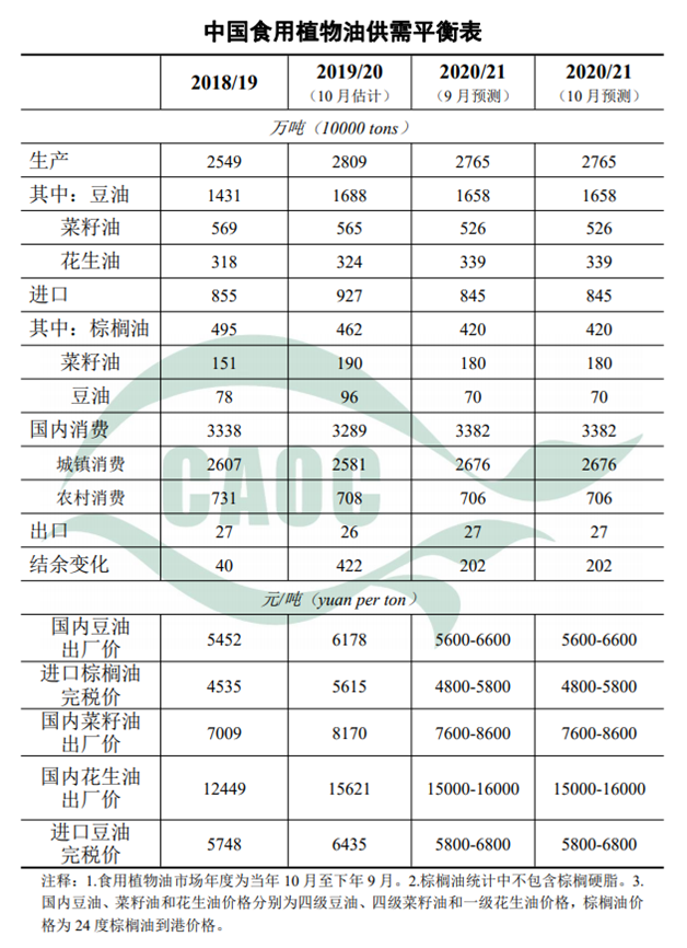 本月,2019/20市場年度結(jié)束,中國食用植物油產(chǎn)量2809萬噸,較上月估計值增加28萬噸,主要是因?yàn)榇蠖惯M(jìn)口量調(diào)增帶動豆油產(chǎn)量增加;食用植物油進(jìn)口量927萬噸,較上月估計值增31萬噸,主要是因?yàn)?a href="http://www.rongk.cn/seed/youcai/" target="_blank">油菜籽進(jìn)口量大幅減少,油脂進(jìn)口利潤可觀;食用植物油年度均價均在預(yù)測范圍之內(nèi)。