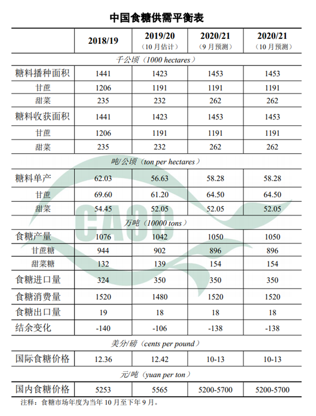 2020/21年度中國食糖產(chǎn)銷已經(jīng)開始,截至9月底,新疆和內(nèi)蒙古自治區(qū)甜菜糖產(chǎn)區(qū)各有6家糖廠開機(jī),甜菜糖生產(chǎn)基本正常;甘蔗糖生產(chǎn)尚未開始,未來天氣變化及其影響需要密切觀察。本月對2020/21年度中國食糖預(yù)測數(shù)據(jù)暫不調(diào)整。