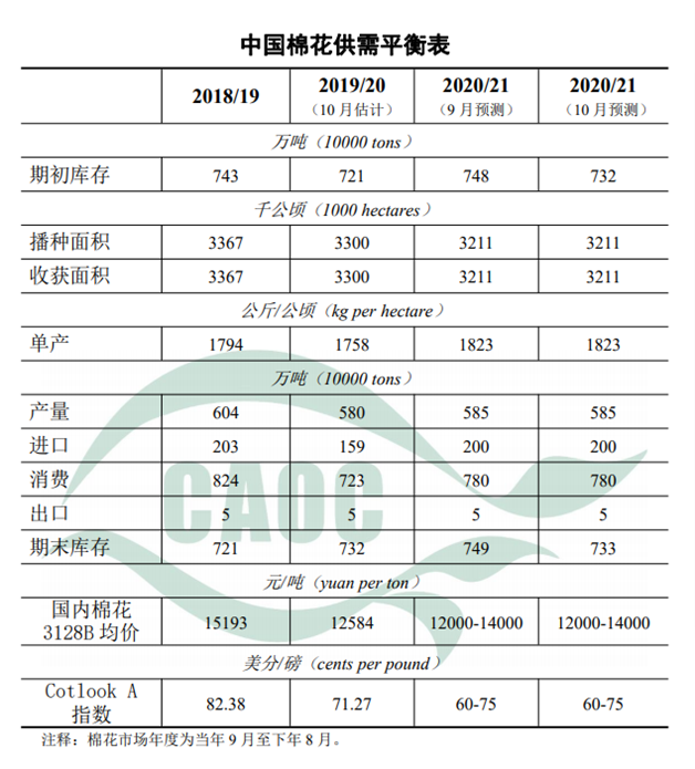 2019/20棉花市場年度結(jié)束,棉花進(jìn)口為159萬噸,期末庫存估計為732萬噸,均調(diào)減16萬噸;國內(nèi)3128B級棉花均價為每噸12584元,Cotlook A指數(shù)均價為每71.27美分,均處于預(yù)測區(qū)間。9月,新疆大部棉區(qū)光溫條件較好,北疆手采和機(jī)采時間提早,交售價格回升。長江中下游9月以來部分地區(qū)陰雨天氣導(dǎo)致爛鈴多發(fā),對棉花單產(chǎn)和品質(zhì)的影響有待進(jìn)一步跟蹤評估。2020/21年度棉花生產(chǎn)、消費(fèi)和貿(mào)易均維持上月預(yù)測不變,期末庫存調(diào)減16萬噸至733萬噸。