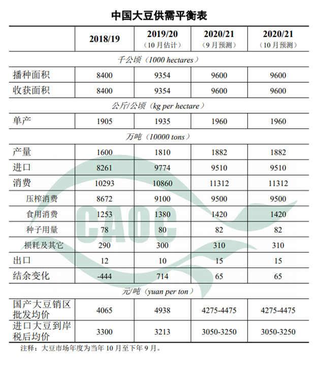 本月對2020/21年度大豆生產(chǎn)、消費(fèi)、貿(mào)易和價格維持上月預(yù)測不變。國內(nèi)方面,9月以來東北農(nóng)區(qū)大部分光溫條件較好,未出現(xiàn)初霜凍,利于大豆成熟,9月上旬臺風(fēng)影響有限,新豆仍呈豐產(chǎn)預(yù)期。國際方面,美國調(diào)低新豆單產(chǎn),但總產(chǎn)仍高于上年,南美地區(qū)大豆已陸續(xù)播種,面積進(jìn)一步增加,預(yù)計新年度全球大豆供給仍保持充足局面。
