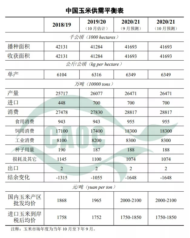 本月預(yù)測,2020/21年度,中國玉米產(chǎn)量、進(jìn)口量、消費(fèi)量等預(yù)測維持上月不變。9 月份全國玉米氣候適宜度均高于上年和近五年平均值,有利于玉米產(chǎn)量形成,玉米總產(chǎn)預(yù)測與上月一致,仍保持穩(wěn)中有增趨勢。短期內(nèi)隨著國內(nèi)新玉米大范圍上市,國家臨儲拍賣玉米出庫,進(jìn)口玉米及其替代品到港量增加,國內(nèi)供應(yīng)將逐步增加,但考慮到飼用消費(fèi)恢復(fù)以及部分受災(zāi)地區(qū)玉米品質(zhì)下降、收獲成本增加等影響,預(yù)計玉米價格將保持基本平穩(wěn)。