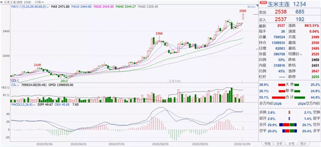 10月首個交易日,玉米期貨跳空高開,大漲3.51%,收于2537元/噸,最高2550元/噸,達(dá)到五年半高位!今年至今已經(jīng)累計上漲超過33%,中長期漲勢預(yù)期還很強(qiáng)烈。