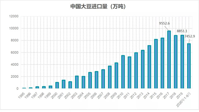 中國是全球頭號大豆進口國。1-9月大豆進口量為7452.9萬噸,較2019年同期的6450.8萬噸增加15.5%。而且,未來數(shù)月中國的大豆進口量料仍維持強勢,按此推算,預計2020年全年的大豆進口有望接近億噸水平,這也將創(chuàng)我國大豆進口數(shù)量歷史新高!