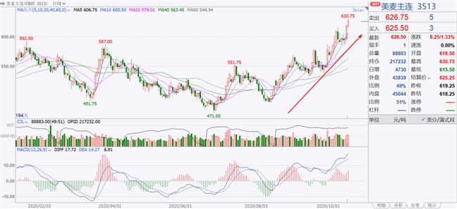 10月16日,CBOT軟紅冬小麥12月合約報收625.25美分/蒲式耳,漲至近六年最高水平,因市場持續(xù)擔(dān)心阿根廷、俄羅斯和美國大平原地區(qū)的干燥天氣威脅到小麥供應(yīng)前景。8月份以來美麥主力合約累計上漲18%。