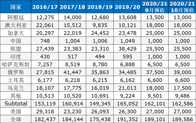 由于干燥天氣影響阿根廷小麥,2020/21年度迄今為止歐盟和英國的軟小麥出口量比上年同期減少近30%,而8月份英國的小麥進口量同比增加45%。目前國際谷物理事會(IGC)預(yù)計2020/21年度全球小麥期末庫存為6.289億噸,但是考慮到上述分析,未來幾個月該庫存數(shù)據(jù)有可能下調(diào)。