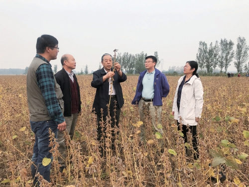 有關(guān)專家在田間考察大豆新品種“鄭1307”的長(zhǎng)勢(shì)。