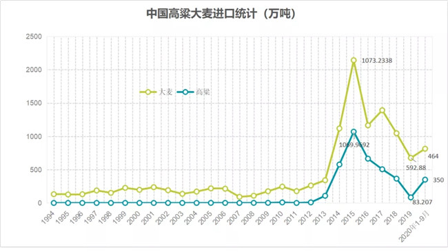 9月進(jìn)口高粱57萬(wàn)噸,同比增長(zhǎng)356.1%,1-9月累計(jì)進(jìn)口350萬(wàn)噸,同比增長(zhǎng)462.8%。