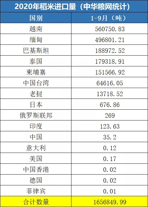 中國(guó)9月大米進(jìn)口糧為15.86萬(wàn)噸,較去年同期減少10.24%;1-9月累計(jì)進(jìn)口量為165.68萬(wàn)噸,略低于去年同期170萬(wàn)噸的水平。