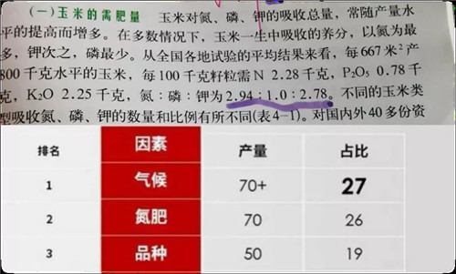 下圖是國家玉米產(chǎn)業(yè)體系崗位專家李少昆博士的著作和美國弗雷德教授的科研結(jié)果截圖,每生產(chǎn)100斤玉米籽粒必須吸收2.28斤純氮、0.78斤純磷、2.25斤純鉀;同時,氮肥對玉米產(chǎn)量的貢獻占1/4以上。