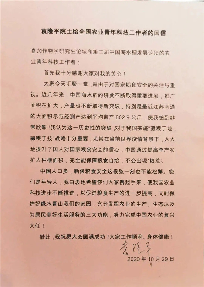 以下是袁隆平院士的回信全文↓↓↓