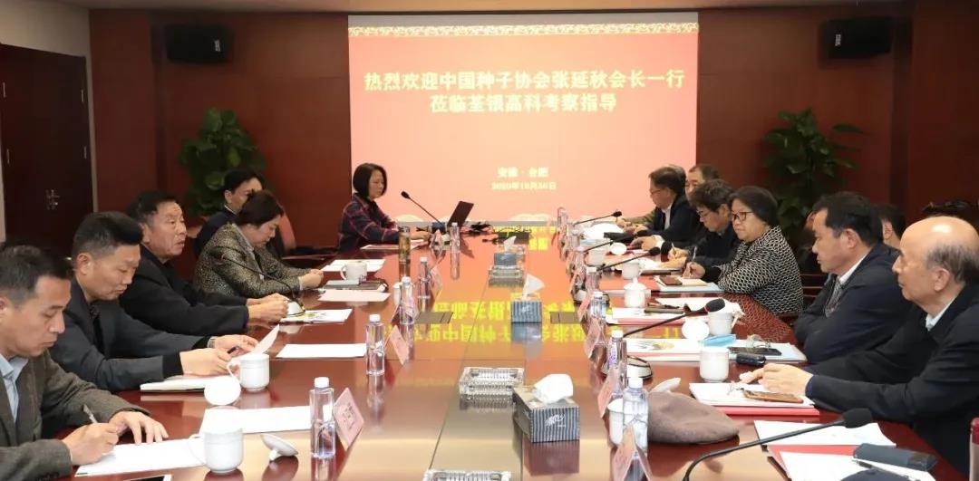 2020年10月30日,中國(guó)種子協(xié)會(huì)會(huì)長(zhǎng)張延秋、副會(huì)長(zhǎng)兼秘書長(zhǎng)蔣協(xié)新、副會(huì)長(zhǎng)馬淑萍,中國(guó)種子協(xié)會(huì)顧問組組長(zhǎng)李立秋等領(lǐng)導(dǎo)一行,蒞臨我會(huì)會(huì)長(zhǎng)單位荃銀高科考察調(diào)研。荃銀高科創(chuàng)始人、張海銀種業(yè)基金會(huì)理事長(zhǎng)張海銀,安徽省種子協(xié)會(huì)會(huì)長(zhǎng)、荃銀高科副董事長(zhǎng)、總經(jīng)理張琴,秘書長(zhǎng)葉飛,荃銀高科常務(wù)副總經(jīng)理王玉林,副總經(jīng)理朱全貴、江三橋,張海銀種業(yè)基金會(huì)秘書長(zhǎng)張彤等參加座談會(huì)。