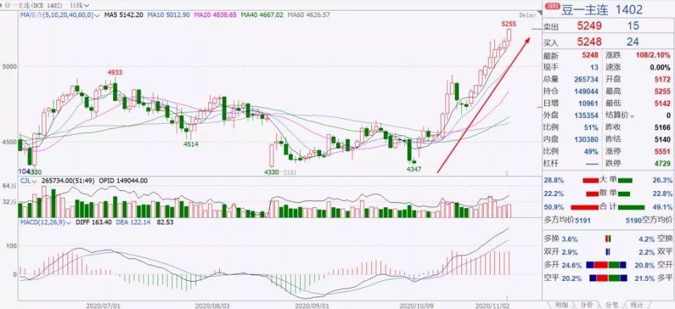 今天,豆一繼續(xù)大漲108元/噸,收于5248元/噸,連續(xù)第九日在高位上沖,主力合約期價(jià)最高漲至5255元/噸,超過(guò)了2008年12月創(chuàng)下的5246元/噸歷史高位,是今年繼玉米創(chuàng)下歷史高位之后,又一個(gè)刷新歷史新高的農(nóng)產(chǎn)品期貨品種。大豆利多基本面沒(méi)有明顯變化,現(xiàn)貨價(jià)格高位堅(jiān)挺繼續(xù)支撐期貨價(jià)格。外盤(pán)方面美大豆期貨接連沖高,刺激國(guó)內(nèi)市場(chǎng)。