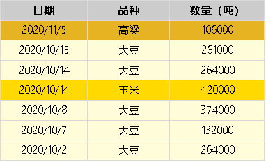 今年為履行第一階段貿(mào)易協(xié)議承諾,中國瘋狂搶購美國農(nóng)產(chǎn)品,甚至一度連續(xù)14個工作日下單美豆,對美國玉米的單日下單更是創(chuàng)下紀(jì)錄高位,高梁、小麥和豆油也紛紛進入采購清單。然而,10月中旬以來,中國買家卻一反常態(tài)的暫停購買美國農(nóng)產(chǎn)品,直至11月5日才購買了一筆10.6萬噸的美國高梁。