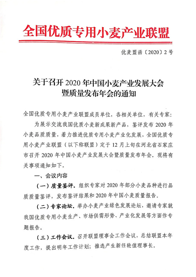 關(guān)于召開(kāi)2020年中國(guó)小麥產(chǎn)業(yè)發(fā)展暨質(zhì)量發(fā)布年會(huì)的通知