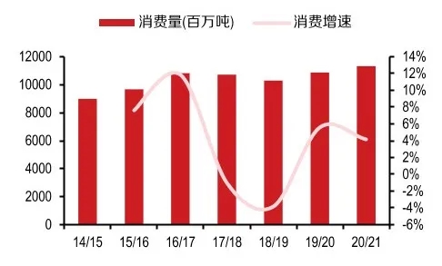 ↑2020/21年度國(guó)內(nèi)大豆消費(fèi)量約為1.13億噸,同比增漲4.2%