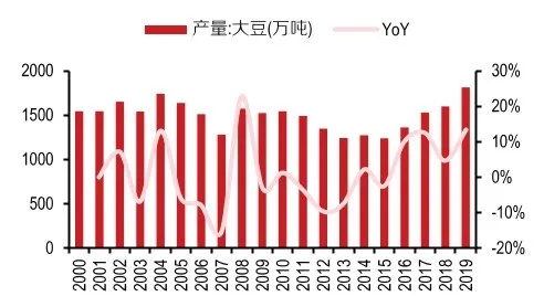 雖然近些年在國(guó)家的扶持下,國(guó)內(nèi)大豆產(chǎn)量開(kāi)始呈現(xiàn)上漲態(tài)勢(shì),預(yù)計(jì)今年的大豆產(chǎn)量可達(dá)1910萬(wàn)噸,相較于2015年已經(jīng)上漲了50%。